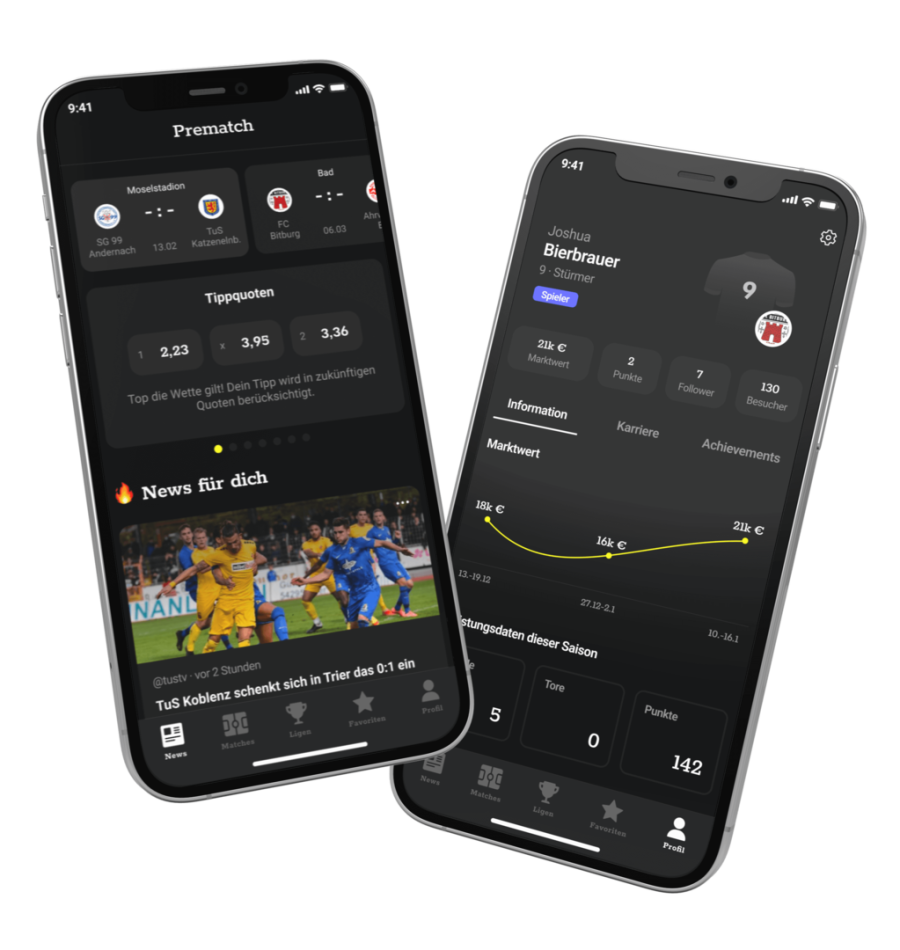 Checke jetzt deinen Marktwert und deine Leistungsdaten. Erhalte aktuelle News und Ergebnisse zu deinen Spielen, von Kreis- bis zur Regionalliga!